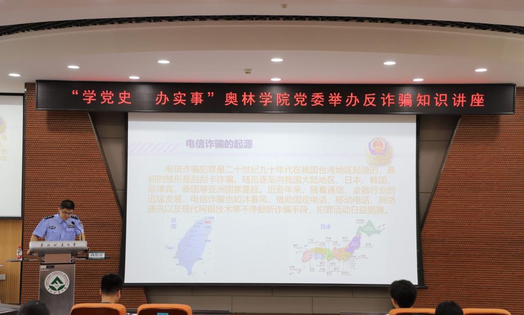 为进一步增强学院师生自身防范意识,提高预防诈骗的能力,7月9日下午,奥林学院党委邀请香坊公安分局反诈中心民警尚伯乐警官开展反诈骗知识讲座,学院师生第三党支部全体党员、各班级学生代表参加了此次讲座。