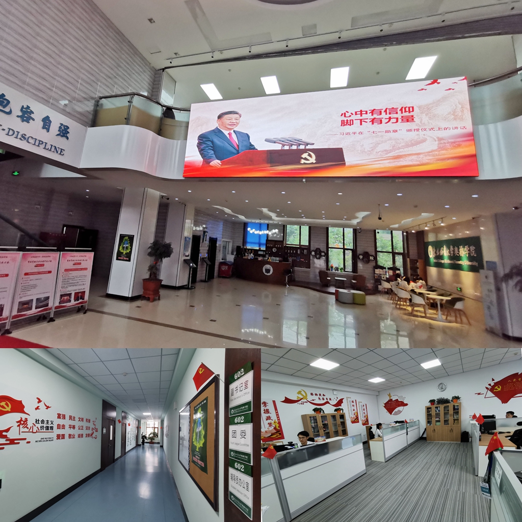 学院党委还将庆祝建党百年与党史学习教育宣传融入日常、抓在经常,将红色元素融入学院公共区域及办公区,并在辅导员办公室中设立党员先锋岗,积极营造全员学习、全员参与的良好氛围,凝聚奋进新征程磅礴力量。学院党委充分利用多媒体设备,将习近平总书记在庆祝中国共产党成立100周年“七一勋章”颁授仪式上的重要讲话金句展播在学院一楼电子大屏上,激励师生党员埋头苦干、攻坚克难,努力创造无愧于党、无愧于人民、无愧于时代的业绩。