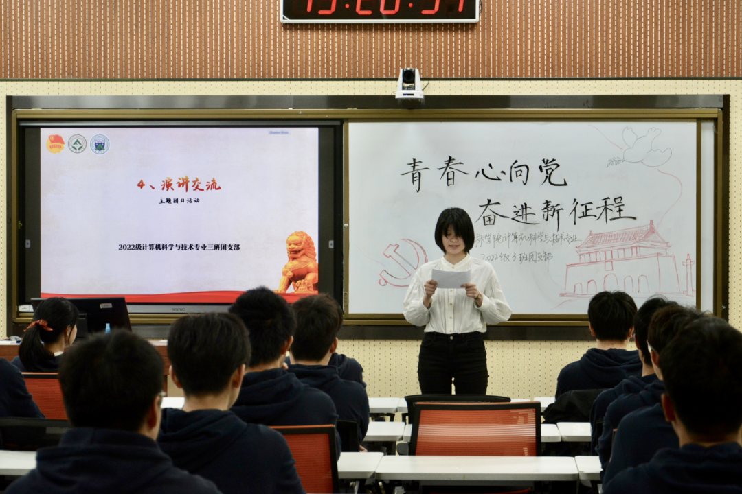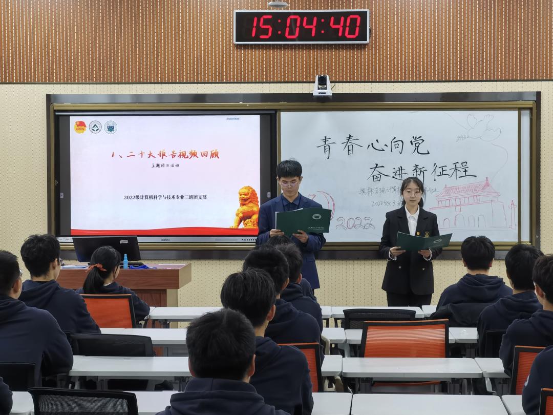 11月12日下午,计算机科学与技术专业2022级3班团支部于奥林楼208教室组织开展了“学习宣传贯彻党的二十大精神”主题团日活动,并通过钉钉向全校进行了直播。活动分为“收看党的二十大报告视频”“主题问答”“党的二十大报告金句”“主题演讲”“感悟分享”等五个部分。2022级辅导员蒋溪淳参加了本次活动。
