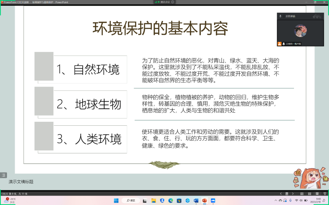 为宣传环保思想,保护绿水青山,理学院2022级信息与计算科学1班卢周召集了身边的朋友,在腾讯会议进行了以《自然:我们永恒的家园》为主题的宣讲。
