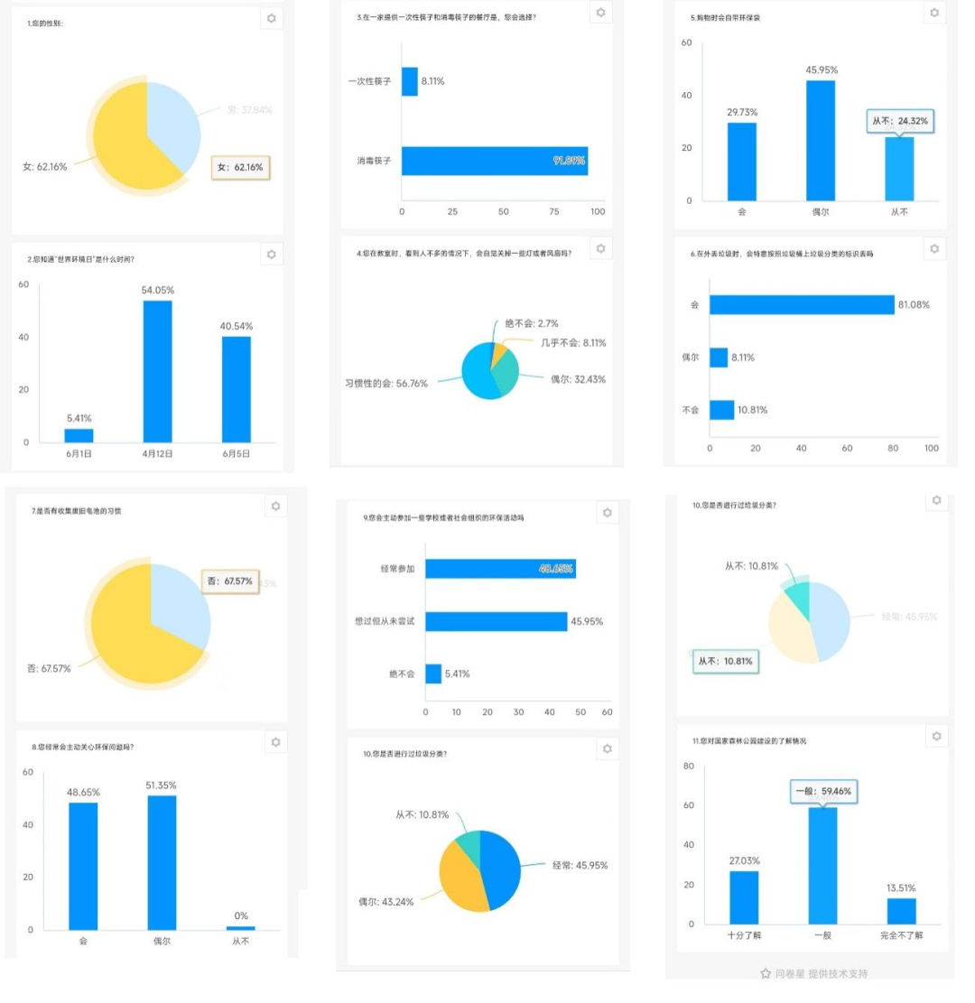 首先,他以“购物时是否会自带环保袋”、“是否有收集废旧电池的习惯”、“是否进行过垃圾分类”、“您对国家森林公园建设的了解情况”等问题自主设计调查问卷。为了节省时间并确保调查样本具有代表性、典型性和说服力,采用抽样调查的方法,对不同地域、不同年龄、不同性别的居民发放电子调查问卷。