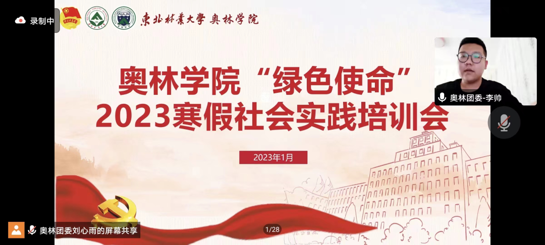 为深入学习宣传党的二十大精神,贯彻落实习近平总书记关于青年工作的重要思想,鼓励返乡大学生开展生态文明科普宣讲,培养东林学子传承绿色使命的责任感,深刻理解“绿水青山就是金山银山”的丰富内涵,同时提高同学们的实践成果质量,强调社会实践相关规定及要求。奥林学院团委于1月20日下午3时组织开展“2023年寒假社会实践培训会”线上会议。本次会议由奥林学院团委书记刘洪良老师参与指导,常务副书记李帅担任主持人,社会实践部部长刘心雨对本次社会实践的主要内容和注意事项进行讲解和答疑。