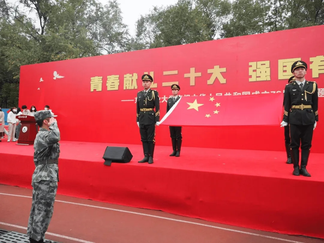 金秋十月,凉风习习。慷慨激昂的国歌奏响,炽如艳阳的国旗飞扬,几百束小红旗追随国旗迎风舞动,正如朝气蓬勃的大学生对祖国表达出的绝对拥护与崇高敬意。凝视着鲜艳的五星红旗,我的脑海中不禁浮现出国庆阅兵,全员抗疫的宏大场面。正因有了祖国的飞速发展与强大庇护,我们才能于此享受安逸的校园生活。青春献礼二十大,强国有我新征程。身为新时代青年,我们应当扛起新时代的责任,勤奋学习,自强不息,积极参与秉持强国有我的信念,参与强国建设的新征程。