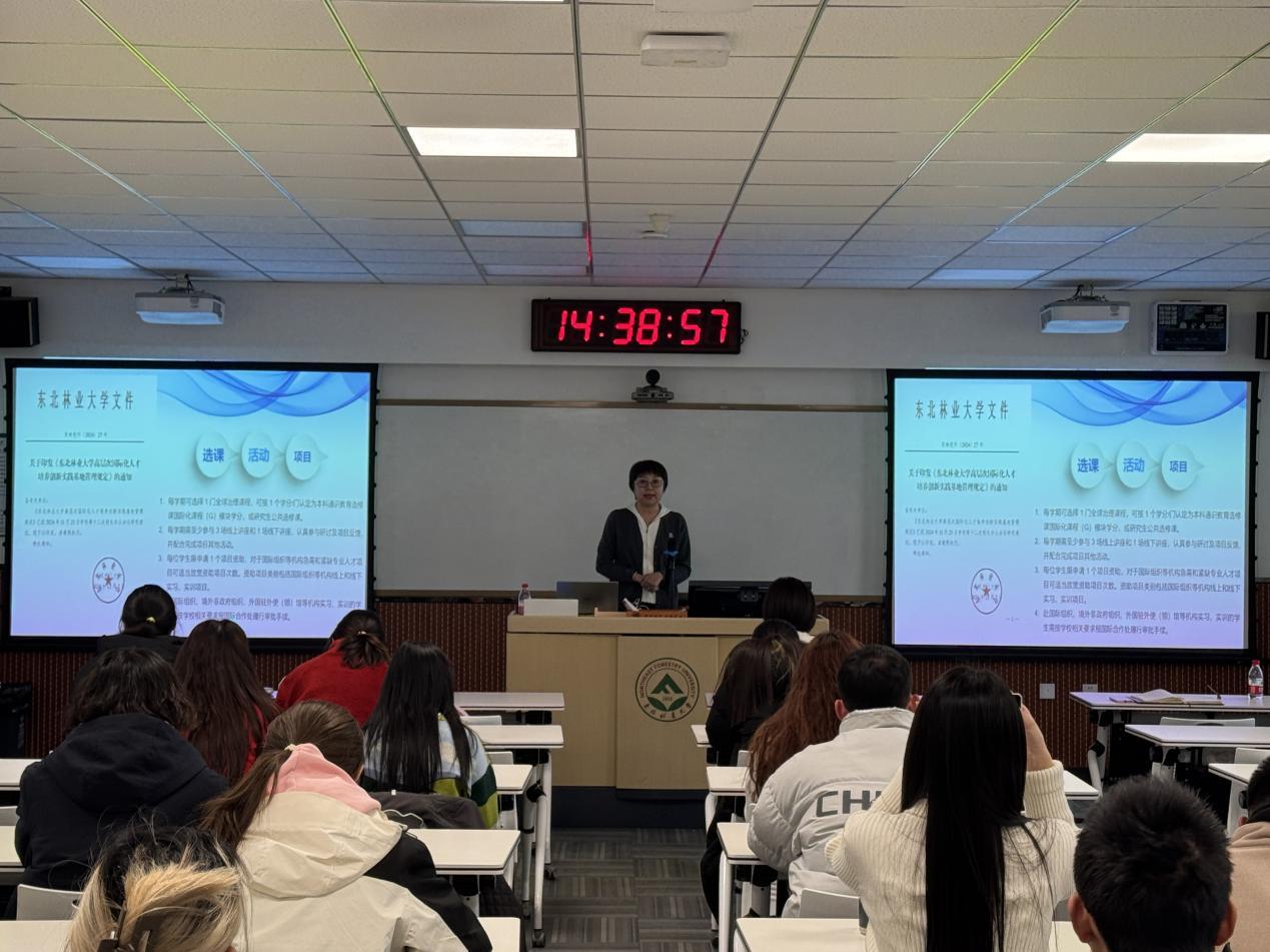 会上,张鸣瑾副院长对新加入高层次国际化人才培养创新实践项目基地班(简称基地班)学员表示欢迎,并为基地班新老学员解读了《东北林业大学高层次国际化人才培养项目管理规定》相关内容,强调了重点注意事项,介绍了基地班全球治理课程、PBL的选课要求及课程的含金量等,并希望学生积极参与基地班课程学习和相关讲座等活动,利用好学习的机会和平台,做好学业规划。