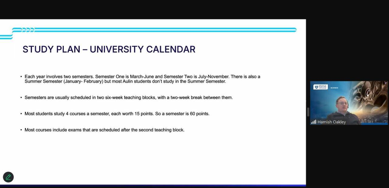 ·学术启航指南针:紧接着,奥大团队负责人Hamish老师、学生指导Sisi 老师和Helen老师针对课程设置、成绩评估、升读研究生要求及课程时间表等核心学术事务进行了详细的介绍,提供了清晰的流程说明和查询、沟通渠道。更是在关键内容部分由Sisi 老师进行了中文讲解,确保来自东林的同学们能够透彻理解、提前做好学习规划,为顺利开启学业奠定坚实基础。