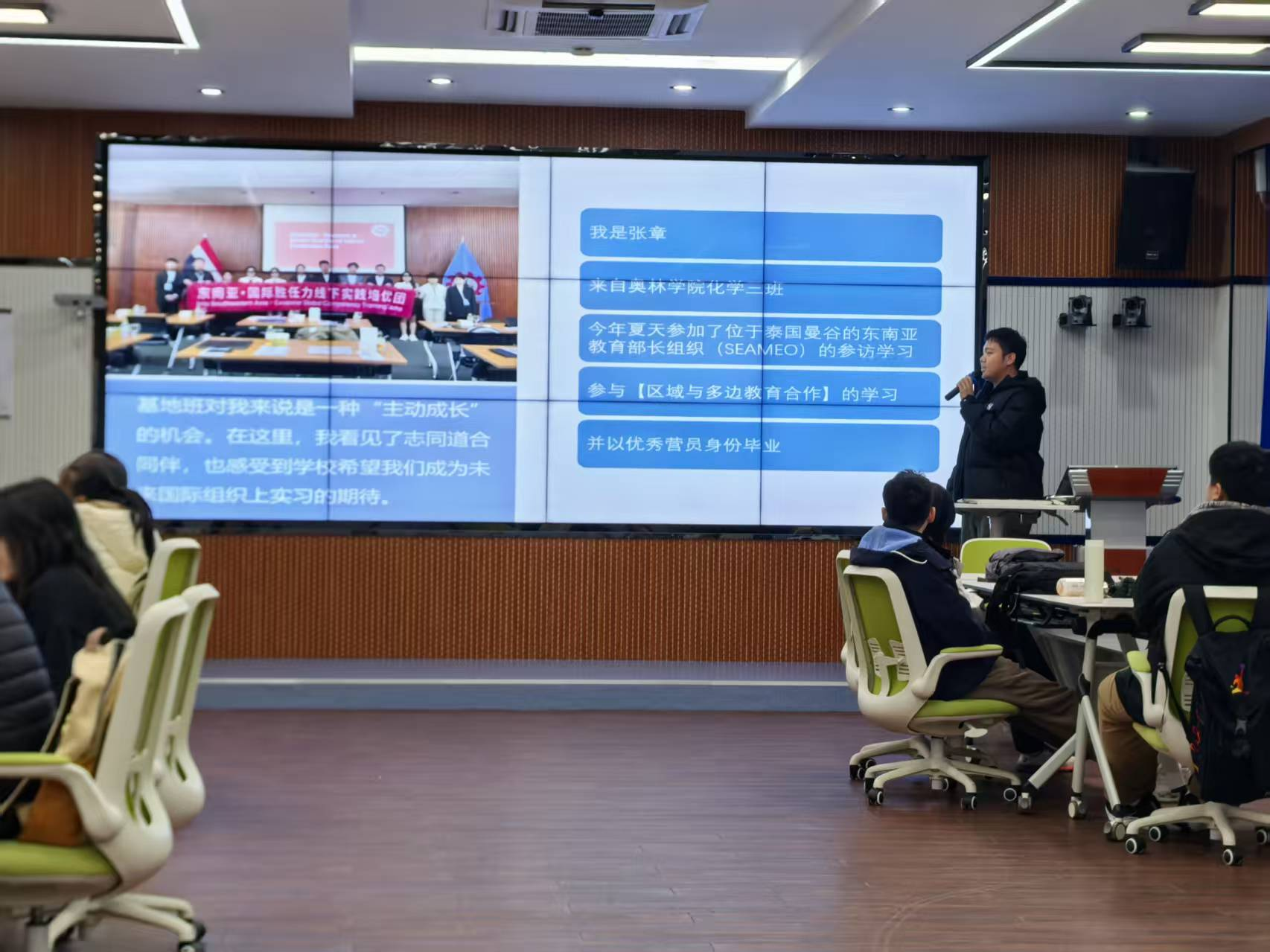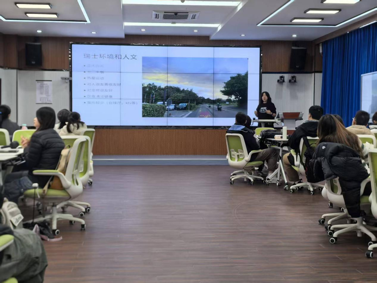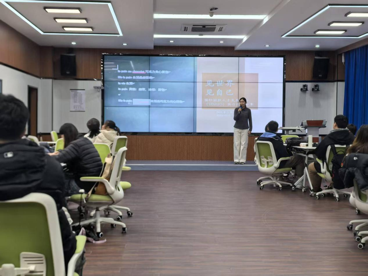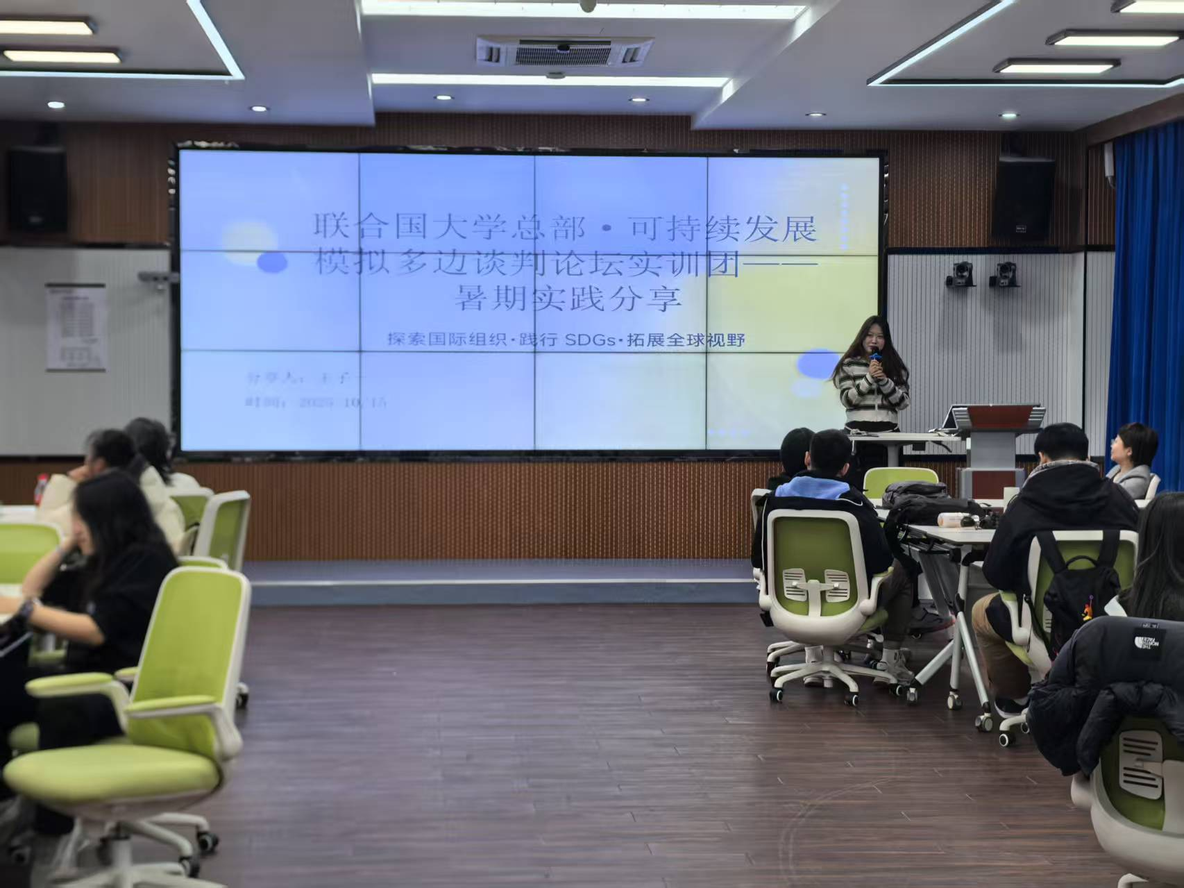 在随后的经验分享环节,四位参与2025年各类实习项目的同学依次发言。刘彦雯分享了在国际组织人才发展学会(TDAIO)的实习经历,通过SDGs项目实践、Climate Fresk气候工作坊及AI Hackthon等活动,深化了对全球治理的理解;王子一讲述了赴联合国大学总部参与“可持续发展模拟多边谈判论坛”的实训过程,围绕人工智能治理主题开展多边谈判训练,并获得国际组织颁发的证书;张文慧结合在瑞士的实习见闻,从人文环境、饮食文化到人生规划,生动呈现了中外文化的碰撞与融合;张章则分享了在东南亚教育部长组织(SEAMEO)的实践经历,通过与国际组织官员面对面交流、参访华为泰国总部及泰国政法大学,提升了跨文化沟通与问题解决能力。